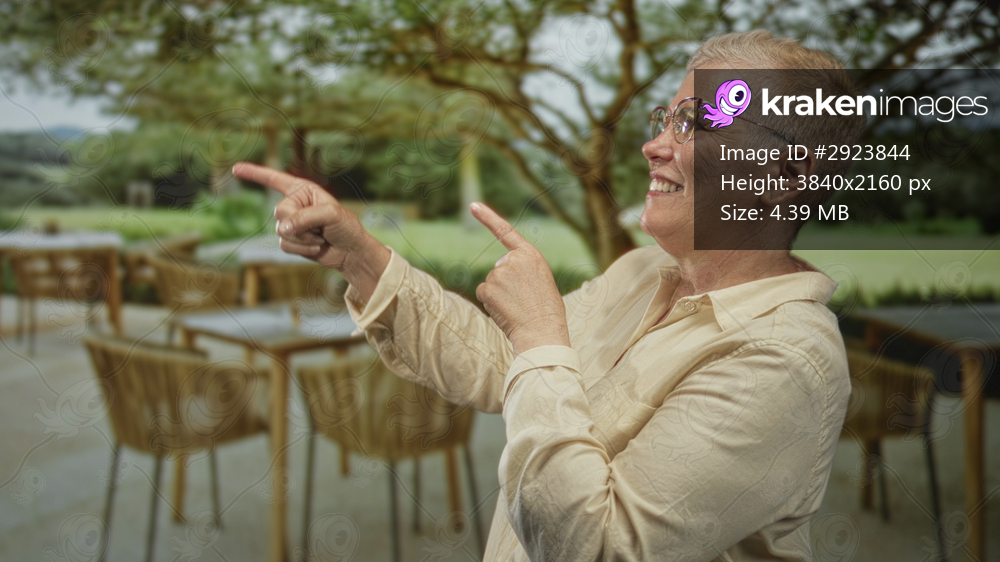 Woman pointing fingers and smiling face toward building terrace cafe at outdoor tables, wearing glasses and light shirt; playful joy.