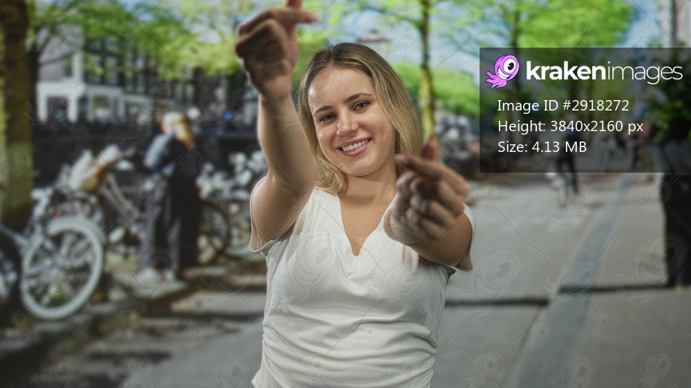 Woman pointing fingers to camera on street smiling with open hands and casual pose; joy playful invitation.