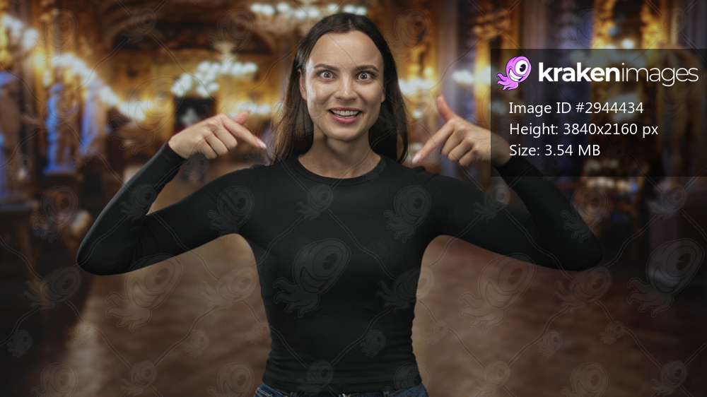 Woman pointing fingers to chest in black long sleeve shirt and jeans inside ornate building gallery, smiling and gesturing to herself; confidence.