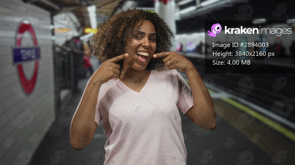Woman pointing fingers to mouth and smiling, showing teeth on a busy train station platform inside a building; joy confidence.
