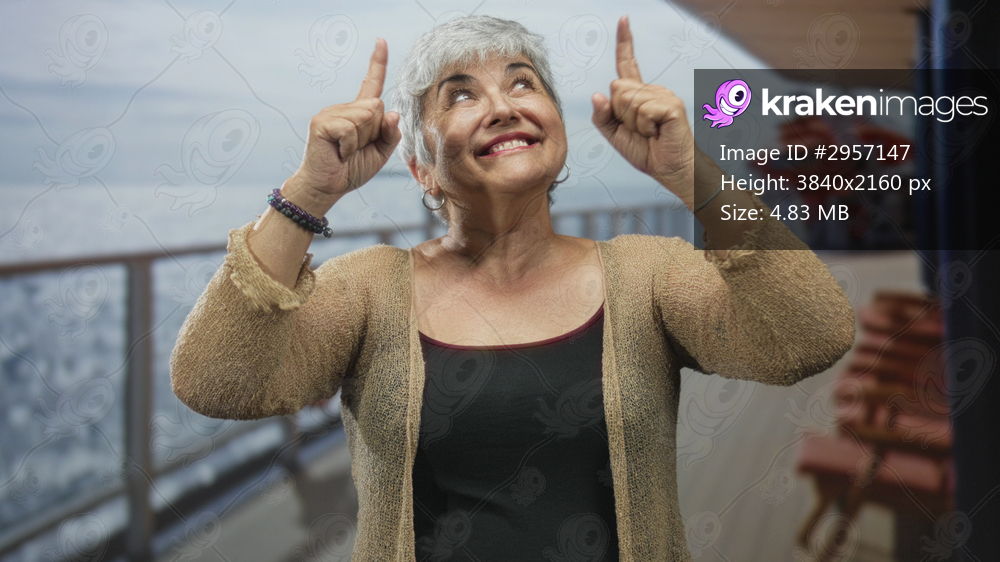 Woman pointing fingers upward on ship deck by railing building, wearing cardigan and hoop earrings; joy hope.