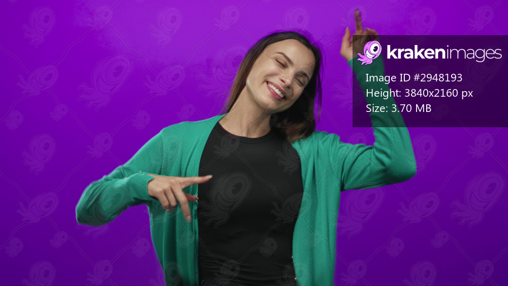 Woman pointing fingers while dancing in a purple studio with solid violet wall and closed eyes enjoying motion; joyful playful groove.