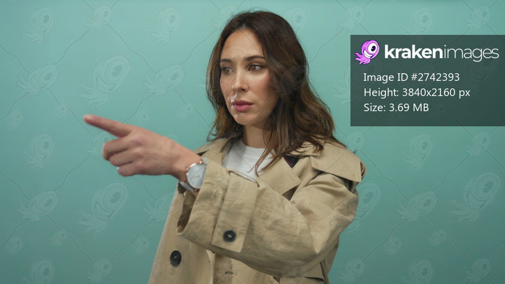 Woman pointing with focused expression against isolated blue background wearing trench coat conveying direction intention confidence determination.