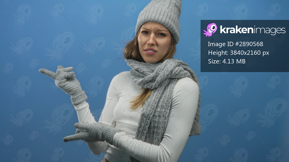Woman pointing with gloved finger while wearing grey beanie and cableknit scarf in studio, showing a slight grimace; confusion doubt.