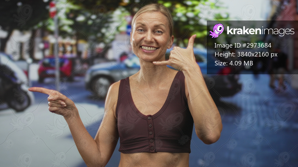 Woman pointing with hand and showing call gesture on a busy street, wearing a sportsbra and smiling broadly; cheerful confidence.