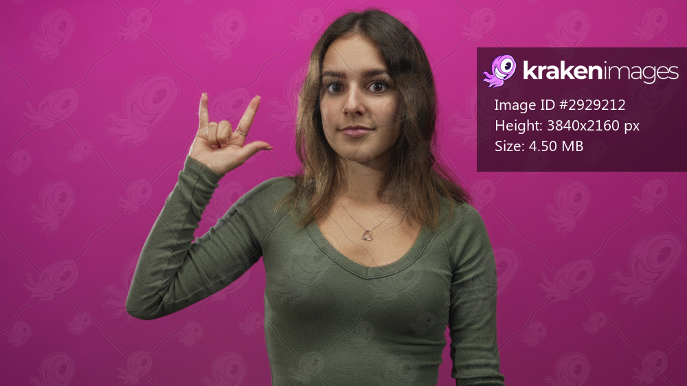 Woman pointing with hand and thumb gesture while wearing a heart pendant against a magenta studio backdrop, young brunette in olive shirt; playful.