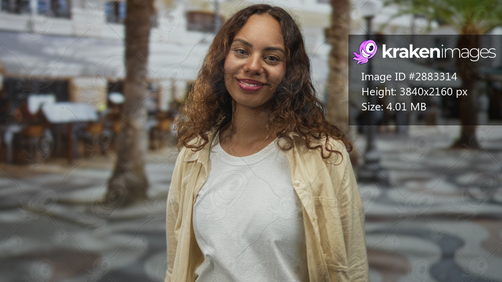 Woman pointing hand toward camera on a sunny street plaza with palm trees and outdoor cafe seating and cobblestone pattern; confidence.