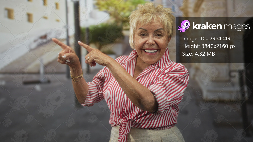 Woman pointing with hands and smiling, wearing striped shirt and bracelets while standing on street; joy curiosity.