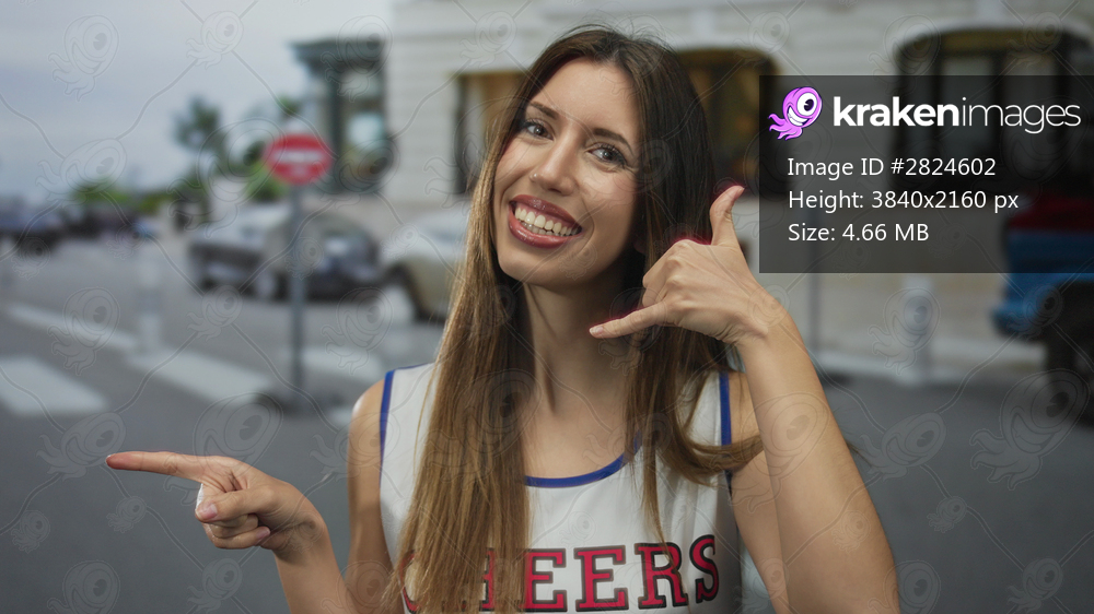 Woman pointing with her left hand and making a call gesture with her right hand in a cheerleader uniform on a street; happiness.