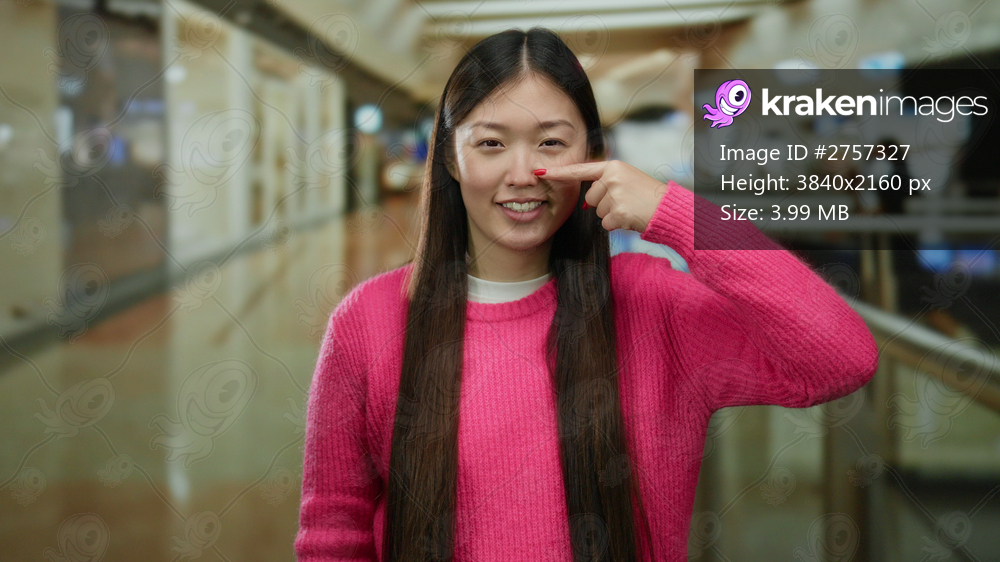 Woman pointing her nose in colorful sweater inside modern mall showcasing cheerful expression in shopping center environment capturing vibrant indoor atmosphere. - Kraken Images