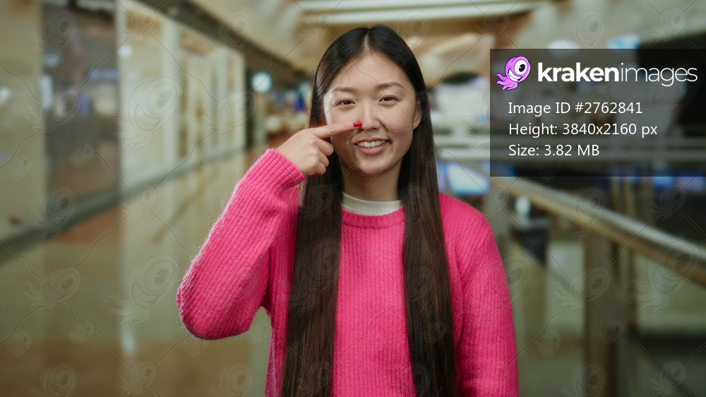 Woman pointing her nose in colorful sweater inside modern mall showcasing cheerful expression in shopping center environment capturing vibrant indoor atmosphere. - Kraken Images
