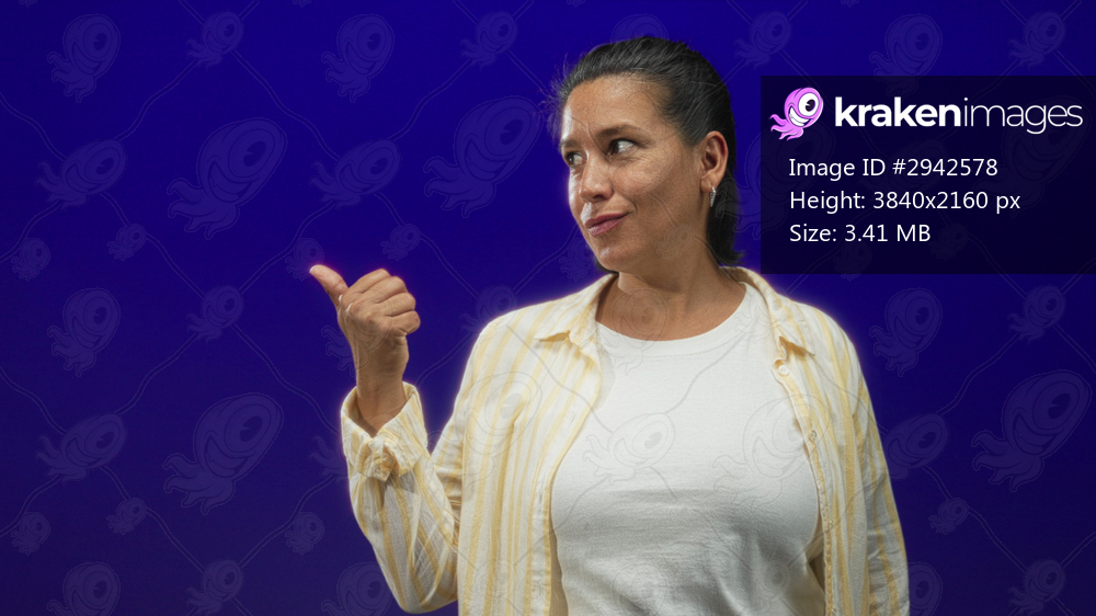 Woman pointing her thumb over shoulder with visible hand and earring, wearing white tee and striped shirt in studio against blue backdrop; confidence.