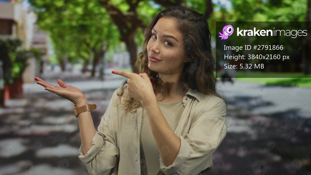 Woman pointing in a sunny park setting with vibrant green trees, showing a playful expression and wearing casual clothing, highlighting a relaxed outdoor lifestyle. - Kraken Images