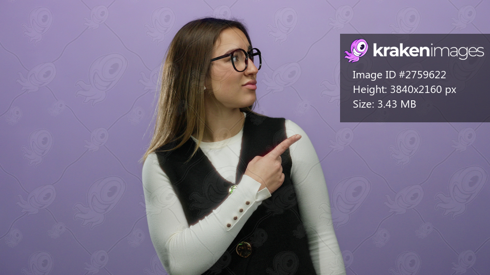 Woman pointing in multiple directions over isolated purple wall wearing glasses and black vest showing indecision confusion and choice concepts young adult expression. - Kraken Images