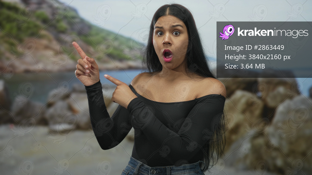Woman pointing index finger at an off frame object in studio wearing black top and denim jeans with wide eyed open mouth expression; astonishment.
