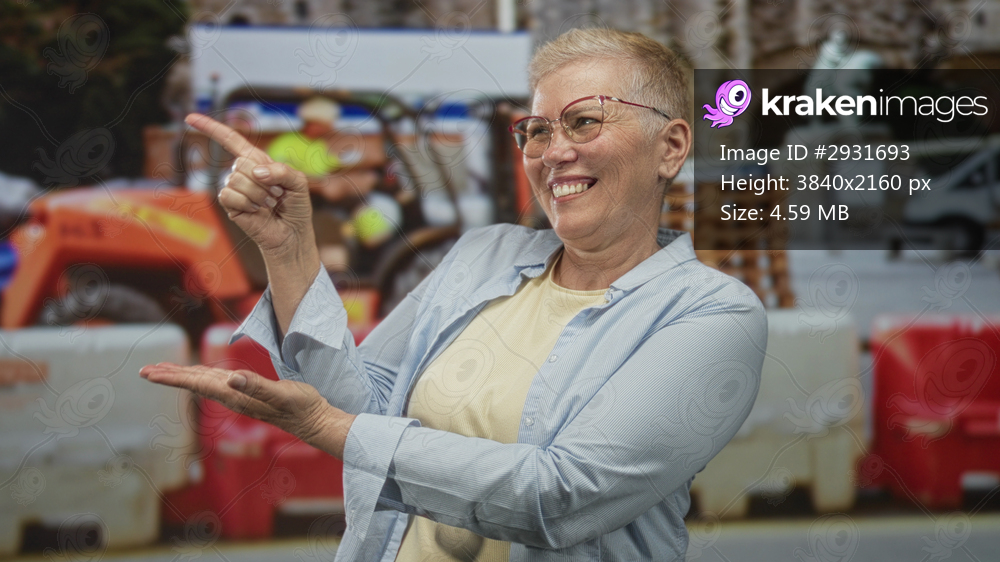 Woman pointing index finger at building construction site, smiling with visible palms and glasses; confidence clarity.