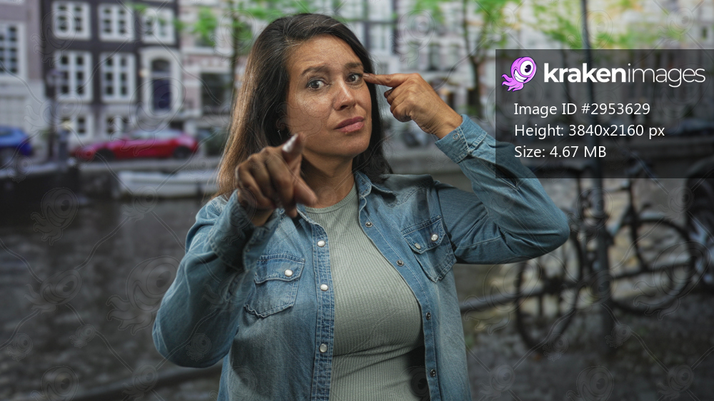 Woman pointing index finger at camera, denim jacket and visible finger in focus on a cobbled street by a canal with bicycles; assertion defiance.