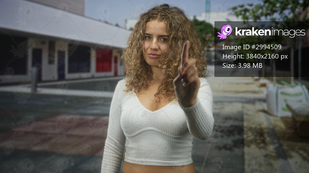 Woman pointing index finger at camera on street, raised bare finger near lens, curly hair and white sweater, neutral serious gaze; confidence warning.