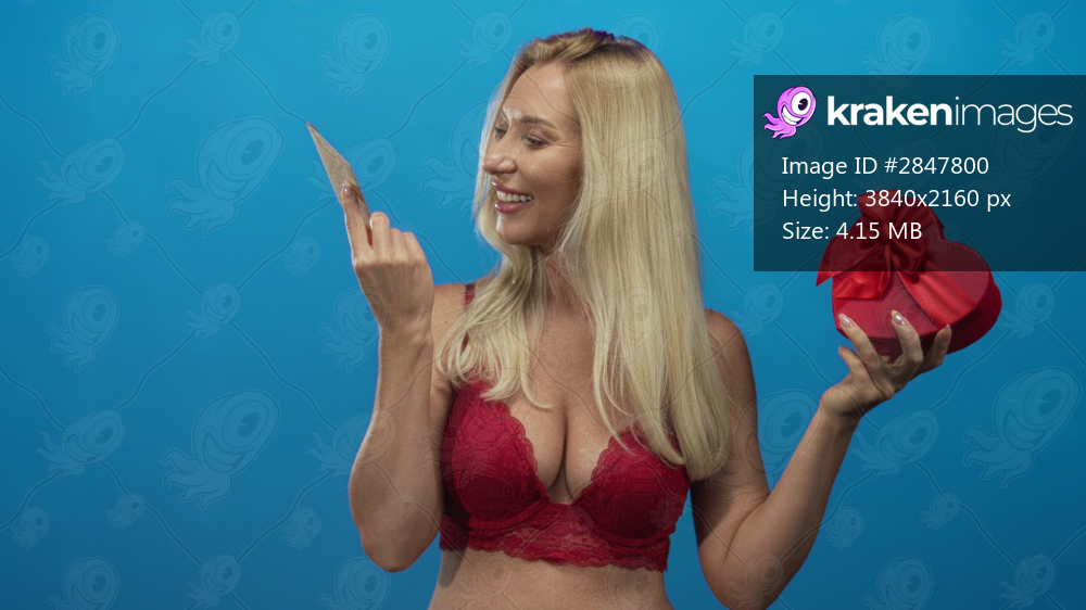 Woman pointing index finger at envelope while holding red heart box in a colorful studio setting; romance.