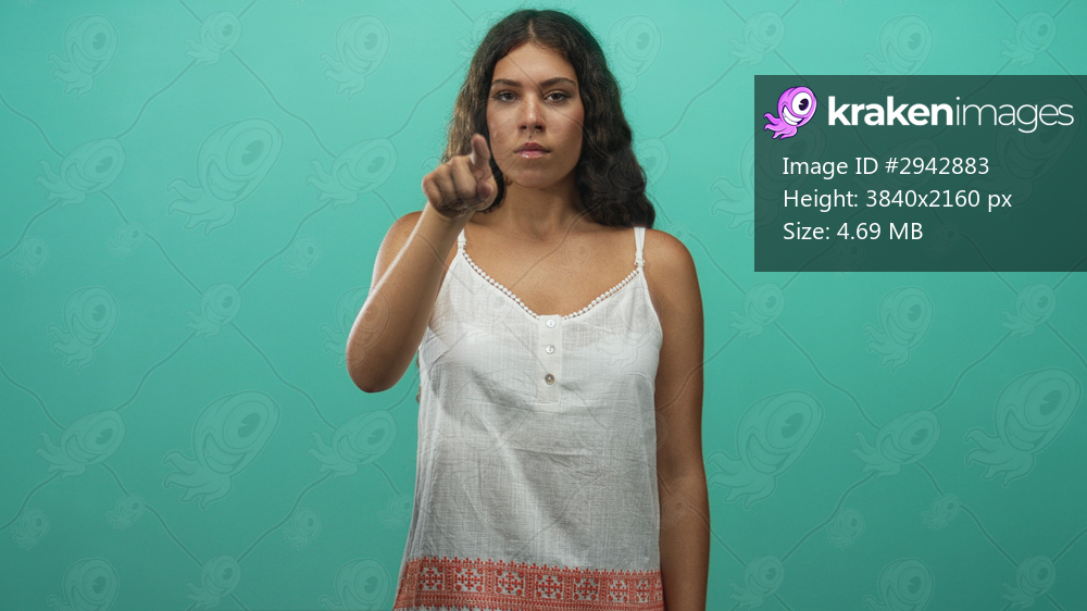 Woman pointing index finger directly at camera in studio wearing white sleeveless sundress with orange trim and teal backdrop; determination.