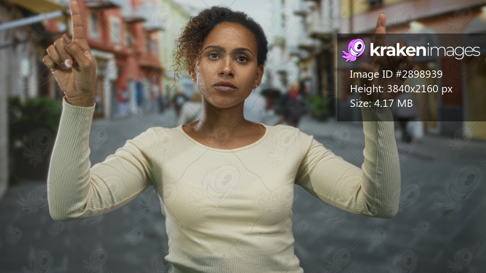 Woman pointing index finger forward on street amid storefronts and pedestrians; determination resolve.