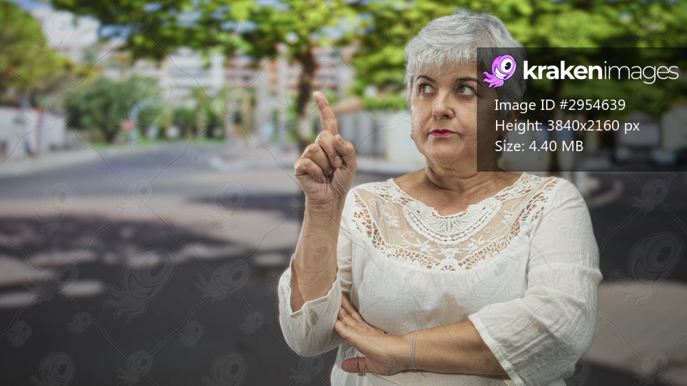 Woman pointing index finger on a city street near trees and buildings, arms crossed and smiling in a white blouse; confidence wisdom.