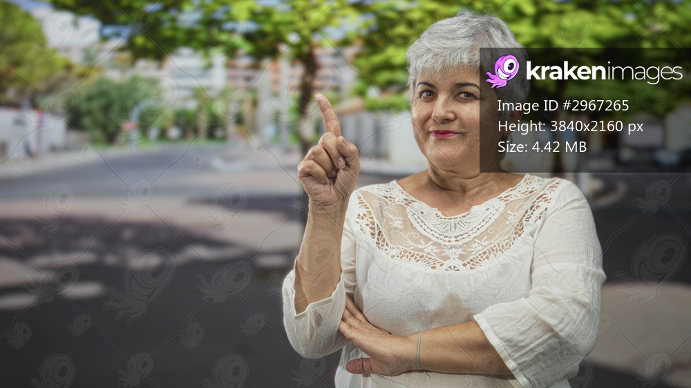 Woman pointing index finger on a city street near trees and buildings, arms crossed and smiling in a white blouse; confidence wisdom.