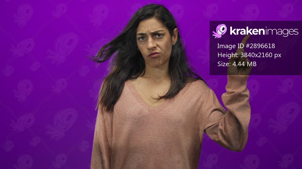 Woman pointing index finger with raised eyebrow in purple studio wearing a pink sweater, hair slightly windblown; disapproval warning.