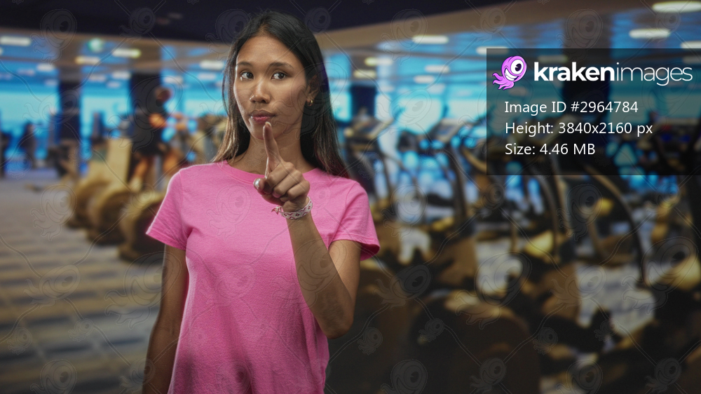Woman pointing index finger to camera, visible hand and wrist raised in front of torso inside gym equipment area of a commercial building; focus discipline. - Kraken Images
