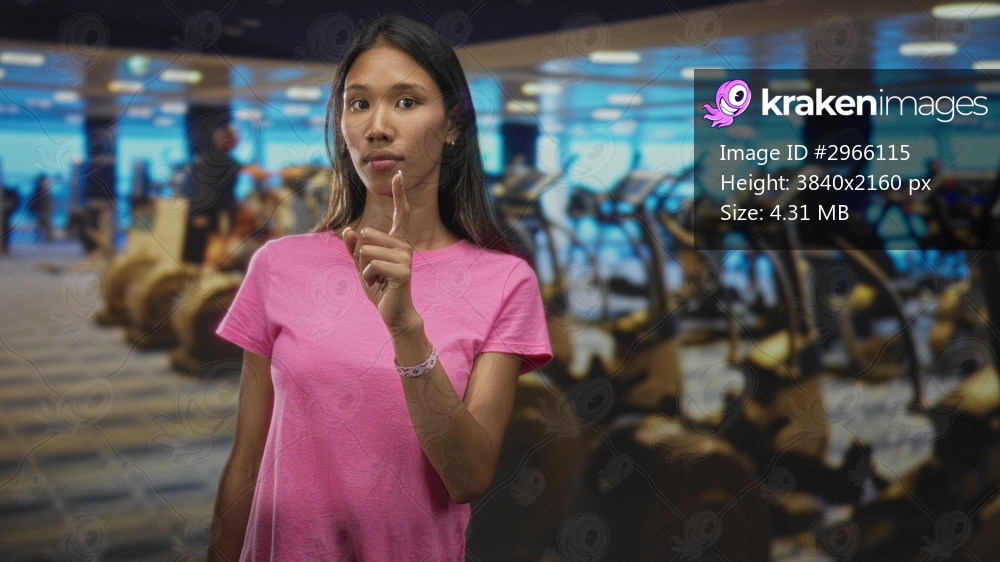 Woman pointing index finger to camera, visible hand and wrist raised in front of torso inside gym equipment area of a commercial building; focus discipline. - Kraken Images