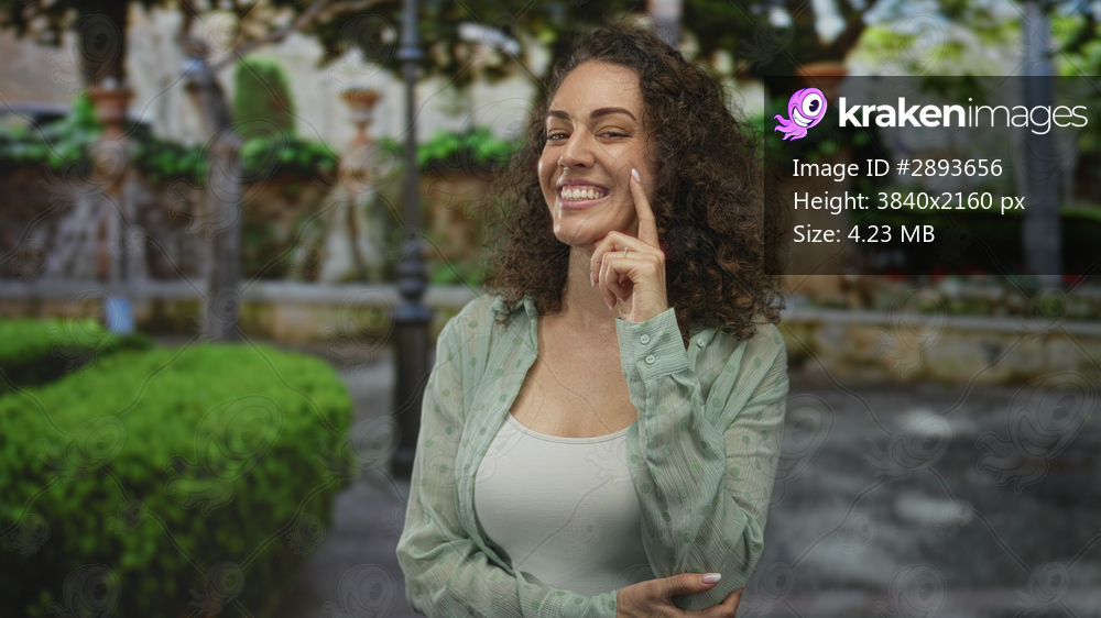Woman pointing index finger to cheek on street near stone fountain and trimmed hedge in light green blouse; confidence.