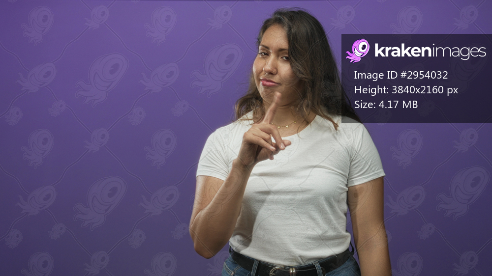 Woman pointing index finger to side in purple studio wearing white tee and jeans with slight smirk; dismissive mood.