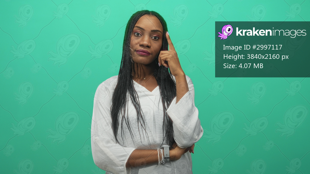Woman pointing index finger to temple with crossed arm, braided hair, wearing white blouse against green studio backdrop; thoughtful.