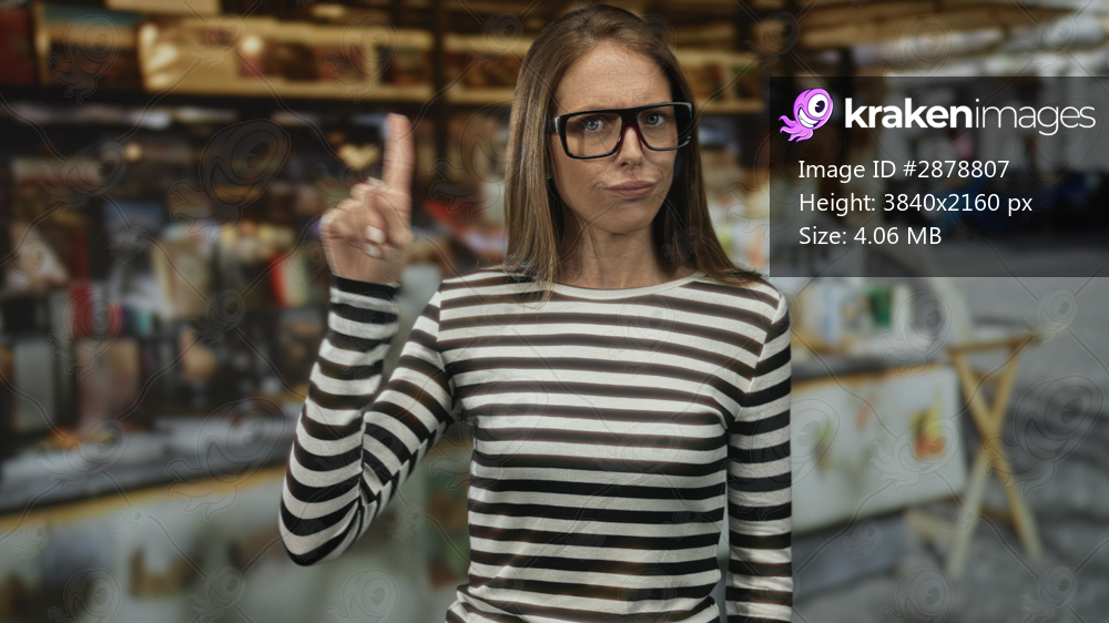 Woman pointing index finger toward camera in a street market stall, striped shirt and glasses, hand raised in a clear warning gesture; firm disapproval. - Kraken Images