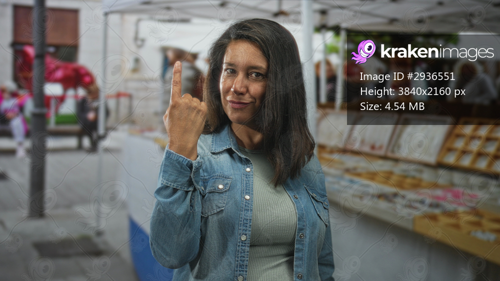 Woman pointing index finger up at street market jewelry stall wearing denim jacket and ribbed top; playful.