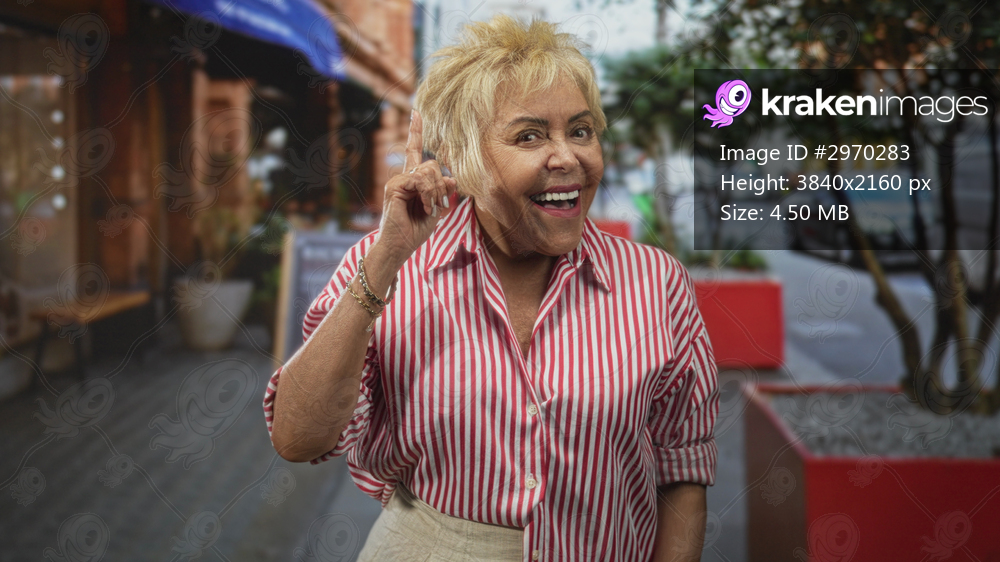 Woman pointing index finger up wearing red and white striped shirt on city street with red planters and cafe awning; joyful warmth.
