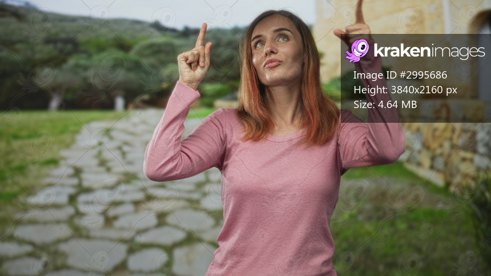 Woman pointing index finger upward beside a stone building on a cobbled path in pink sweater; curiosity discovery.