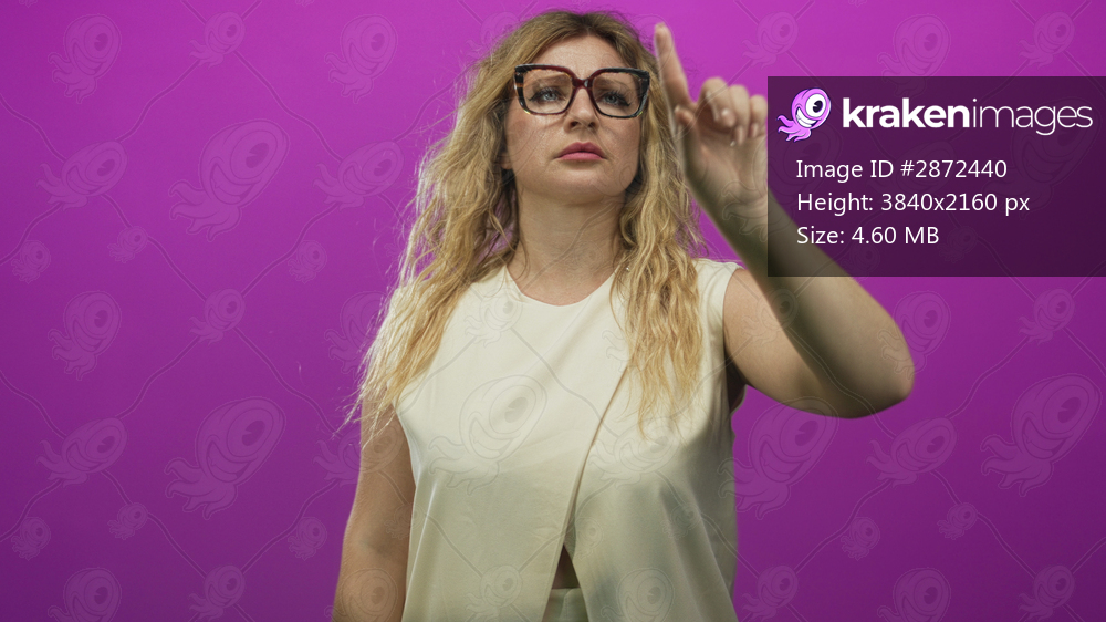 Woman pointing index finger upward in magenta studio with oversized glasses and beige sleeveless top; curiosity exploration.