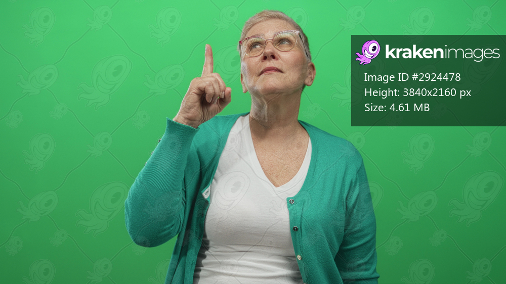 Woman pointing index finger upward in studio against green screen, wearing glasses and teal cardigan over white v neck tee; curiosity.