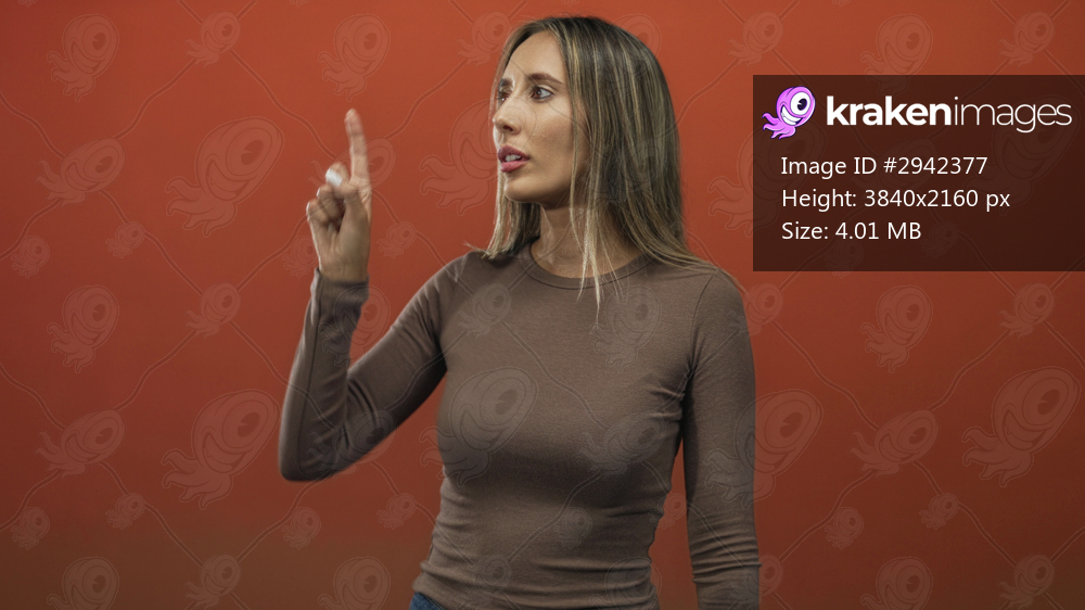Woman pointing index finger upward in studio with orange backdrop wearing brown long sleeve top and jeans; confidence focus.