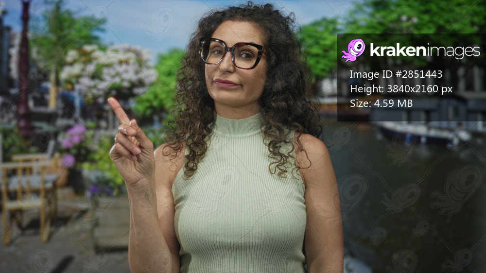 Woman pointing index finger upward next to canal waterfront with moored houseboats on city street; warning caution.