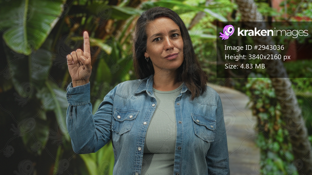 Woman pointing index finger upward on a forest path wearing denim shirt, visible raised hand gesture; confidence.