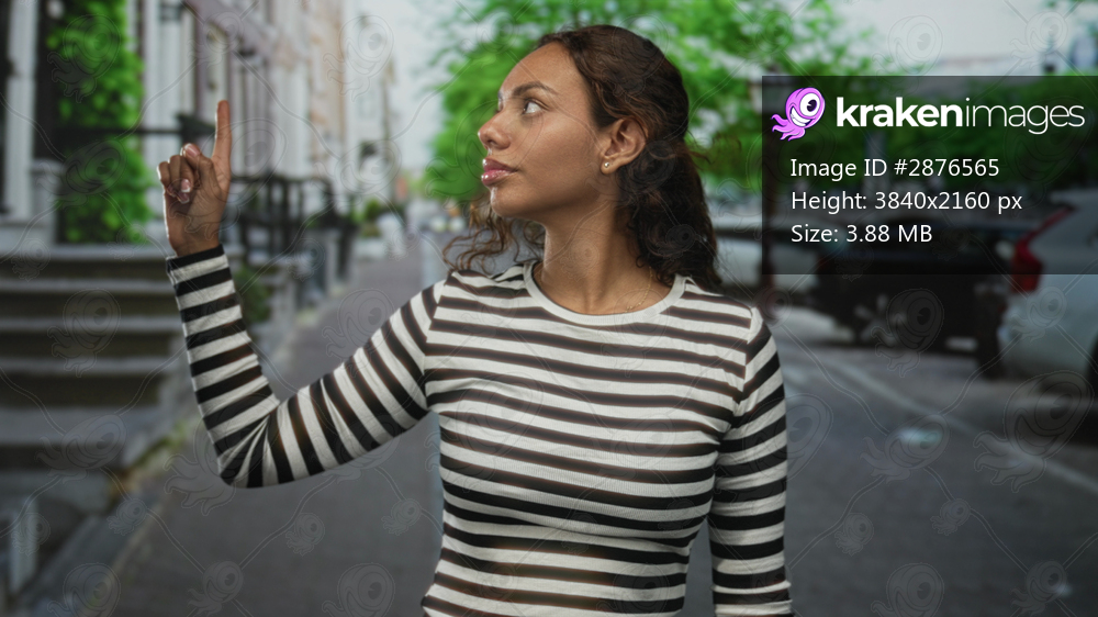 Woman pointing index finger upward on street in city near parked cars and steps, wearing striped shirt and small earrings; confidence focus.