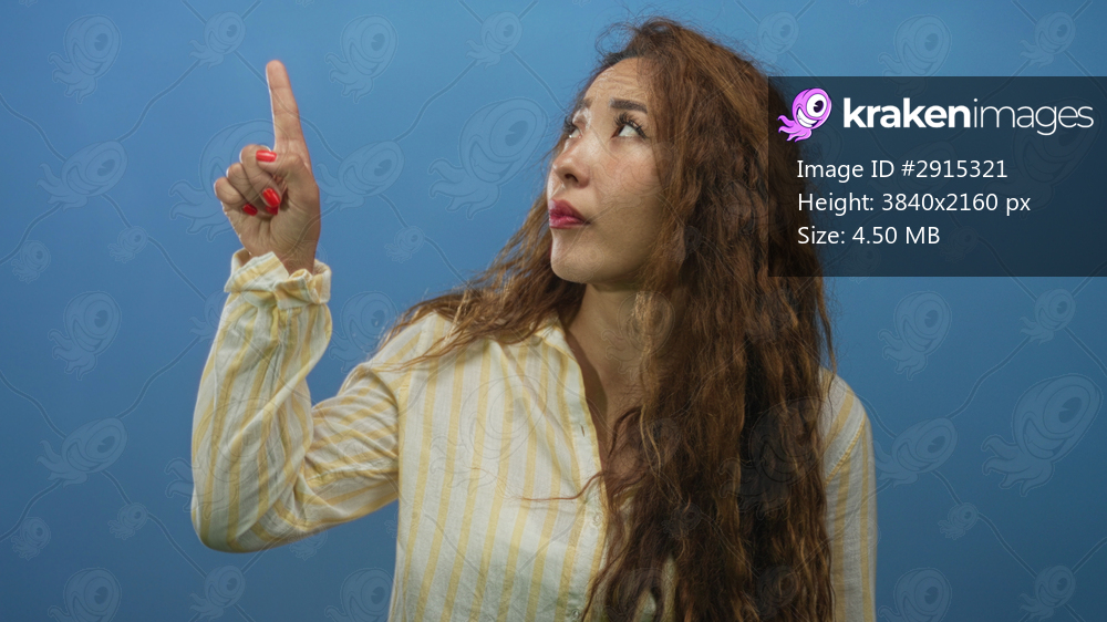 Woman pointing index finger upward with red nails in studio against blue backdrop wearing striped shirt and long curly hair; curiosity.