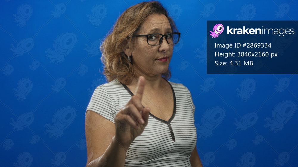 Woman pointing index finger with visible forearm and striped shirt in blue studio wearing glasses and hoop earring; warning.