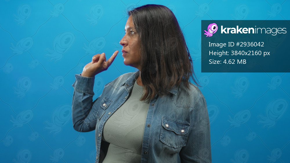 Woman pointing index finger while eyes closed and raised hand gesture in studio; contemplative focus.