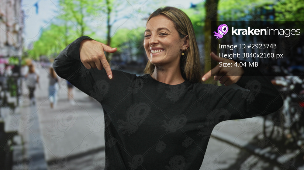 Woman pointing index fingers to her chest on a busy street with bicycles and pedestrians; confidence self belief.