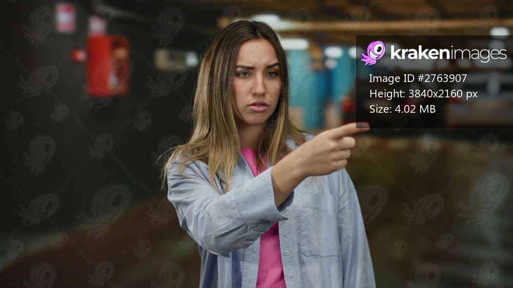 Woman pointing indoors in a dimly lit parking garage, wearing casual attire, showcasing curious and inquisitive expression near cars with a mysterious ambiance. - Kraken Images