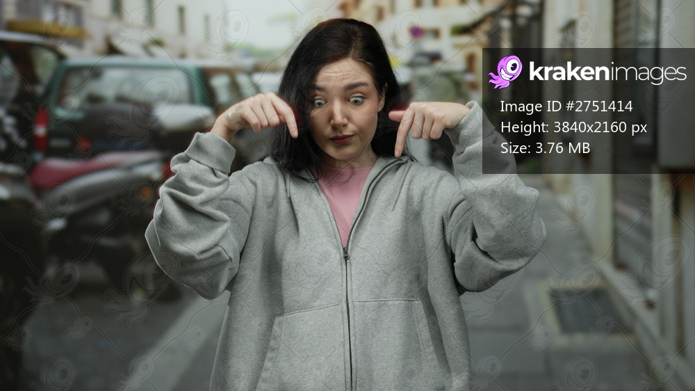 Woman pointing on urban street wearing casual hoodie outdoors surrounded by cars and buildings in lively street setting.