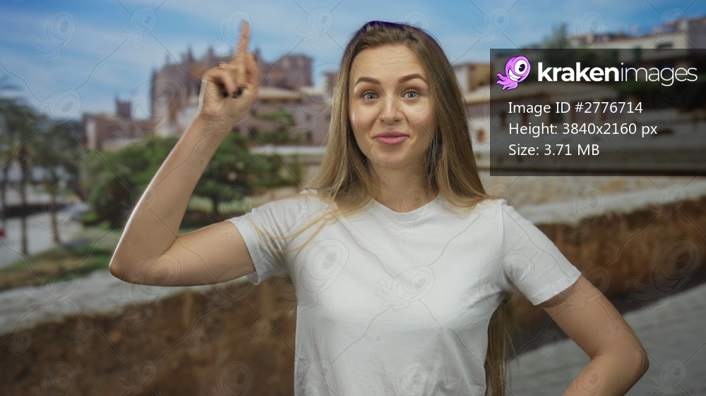 Woman pointing outdoors in old town street under sunny sky with historic buildings and palm trees in the background representing idea and thought.